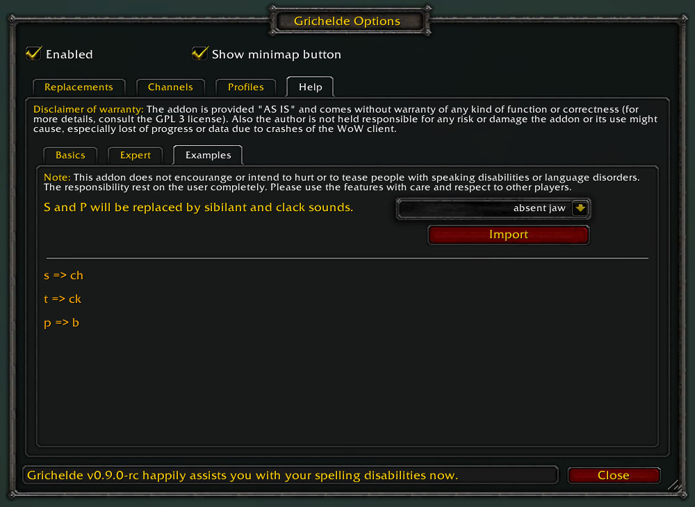 - enable/disable from slash command - matching conditions (never, always, start, end, start or end) - support capturing groups - import examples - testing capabilities - compatibility with WoW Retail - adapted help texts - spelling errors